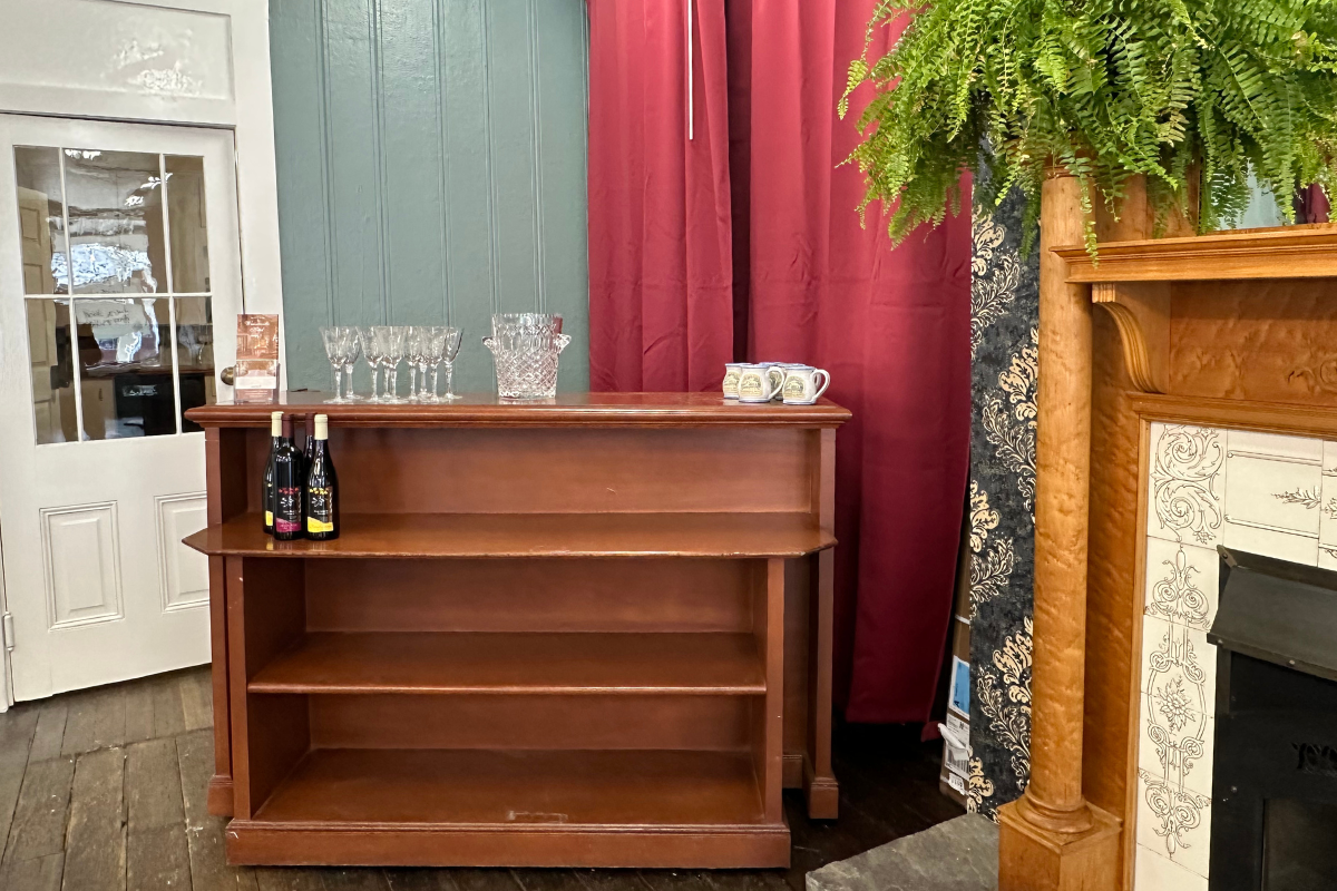 Includes access to a beautifully restored wooden bar on wheels, perfect for beverage service, event refreshments, or displaying catered treats
